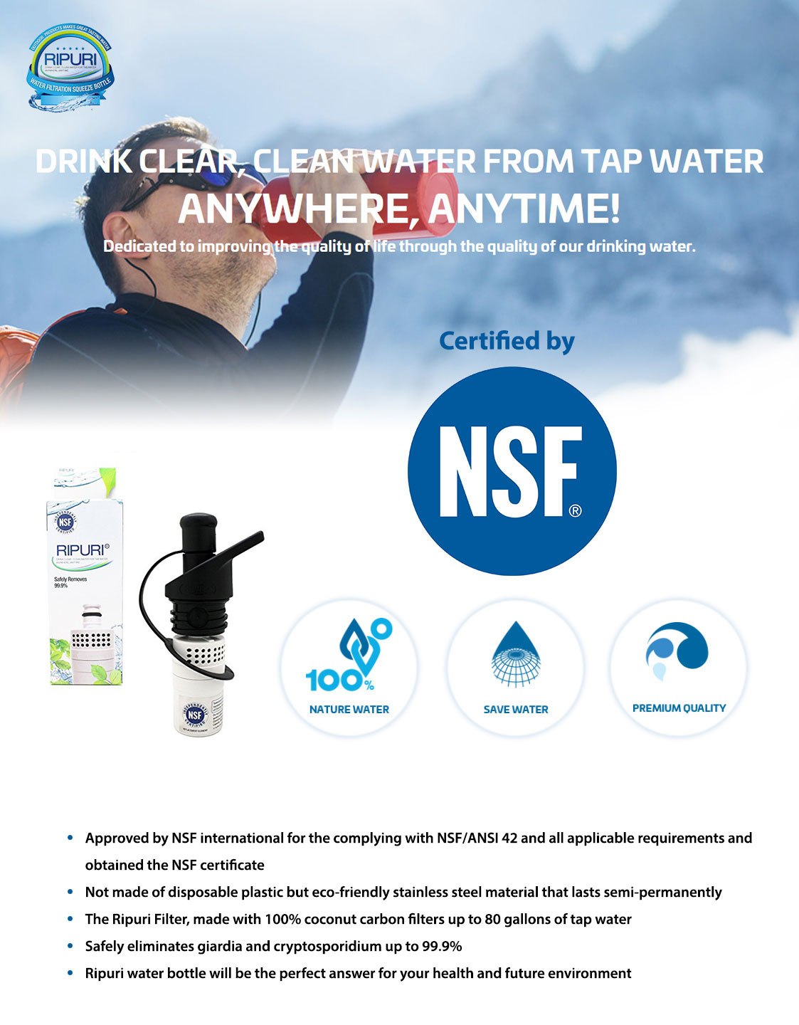 RIPURI water purifier bottle is an eco- and human friendly, fresh and healthy water drinking solution for outdoors, sports, travelling, emergency and everyday use.
